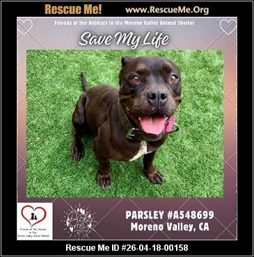 Read more »26-04-18-00158D153URGENT DEADLINE LISTED (f)(female)Staffordshire Bull Terrier mixRiverside County, Moreno Valley, CAID: PARSLEY #A548699